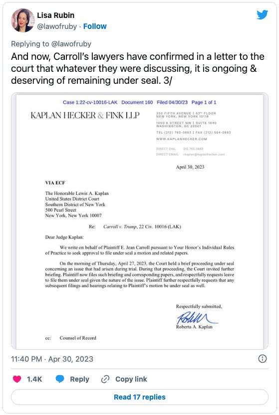First, there is some sort of sealed matter that the judge is overseeing related to the case. The first inkling came when the trial was delayed for a bit Thursday morning while the lawyers met with the judge. Then over the weekend, Carroll’s lawyer filed a letter on the record with the court that referenced Thursday’s “brief proceeding under seal concerning an issue that had arisen during.” It’s not clear what is going on exactly. MSNBC’s Lisa Rubin does a good job laying out in this thread what we do and do not know (teaser: She doesn’t think it’s a run-the-mill evidentiary issue):