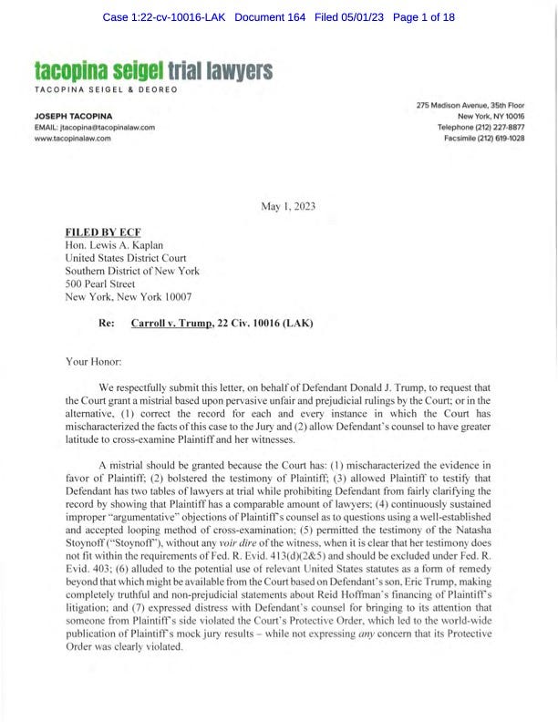 I cannot help wondering about that letter (an ex parte communication to the presiding judge during an ongoing trial) and think it was possibly sent as a way to cause a mistrial (which it would if the judge had responded to it instead of releasing it publicly). If these concerns about judicial errors were genuine, the Trump shysters could have filed a motion instead. And I have to admit, the whole letter is laughable whining, especially their protest about how many lawyers each party has.