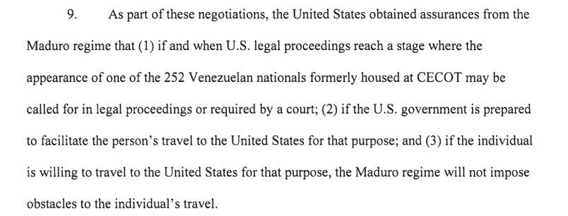 A lot going on there, but what stands out is the stated ability of the Venezuelans to return to the U.S., at least for further court proceedings. In Cristian’s case, the administration was ordered weeks ago to “facilitate” his return to the United States, but it had stonewalled those efforts. In another filing in the case after Cristian was released from CECOT, the Trump administration said the State Department has pledged to help DHS in facilitating his return.