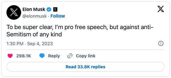It’s rancid stuff, even if it’s very on brand for Musk. But he wants you to know he’s against anti-Semitism. “Super clear” is doing a lot of work here:
