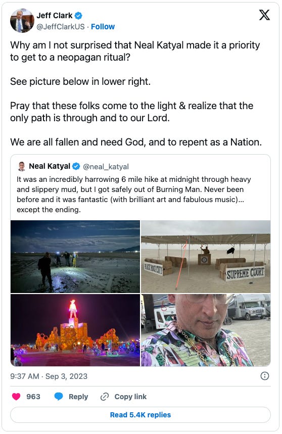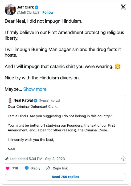 Jeff Clark (Harvard ’89), a former Trump DOJ official overseeing Environment and Natural Resources Division who was admonished by his anti-coup higher ups to go back to his office and they’d call him when there’s an oil spill, a co-defendant of Trump’s in the sweeping Georgia RICO case, and an unindicted co-conspirator in Jack Smith’s Jan. 6 indictment of Trump.