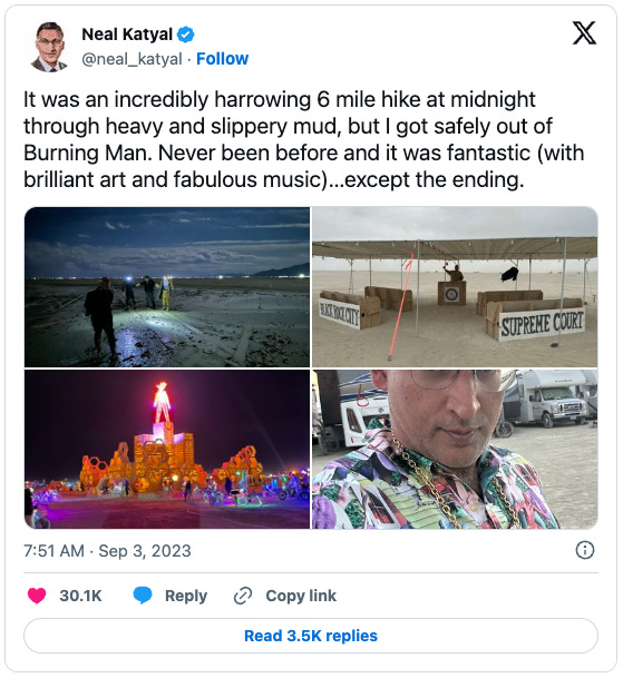 Katyal, who somehow manages to maintain a Supreme Court practice and an active nightlife, went to Burning Man for the first time, got caught up in the torrential rains that turned the playa into an ice-slick, muddy quicksand, and had to hike six miles in the middle of the night to escape the festival: